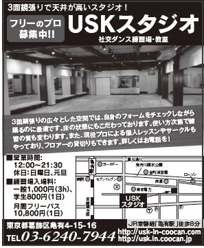一覧に戻る 東京 亀有 USKスタジオ 2019年4月25日 月額制使い放題コース 学割あり 三面鏡張り 練習場詳細 料金 1,000円(3時間) 学生800円(時間制限なし) 月額制使い放題10,800円(時間制限なし) ホームページ http://usk.in.coocan.jp/ 連絡先 03-6240-7944 住所 地図 東京都葛飾区亀有4-15-16 JR常磐線 亀有駅 徒歩8分 京成バス 曳舟十四橋バス停より徒歩2分 GoogleMapで表示 一覧に戻る